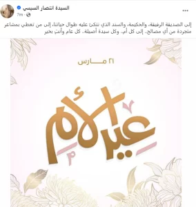 وجهت السيدة انتصار السيسى، قرينة رئيس الجمهورية، رسالة تهنئة إلى الأم المصرية بمناسبة عيد الأم ، قائلة: إلى الصديقة الرفيقة، والحكيمة، والسند الذي نتكئ عليه طوال حياتنا، إلى من تعطي بمشاعر متجردة من أي مصالح.. إلى كل أم.. وكل سيدة أصيلة.. كل عام وأنتِ بخير.