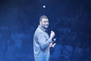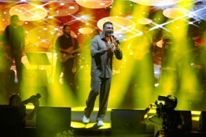 وظهر رامي على مسرح الحفل بـ “لوك” جديد وسط تفاعل كبير ووصلة تصفيق مستمرة من الجمهور، وبدأ في