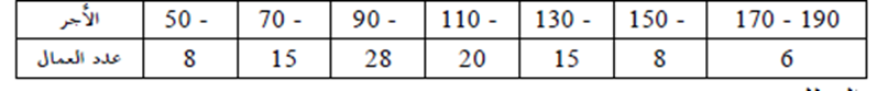 الجدول التكراري التالي يعرض توزيع 100 عامل في مزرعة حسب الأجر اليومي بالريال.