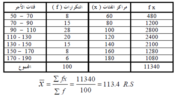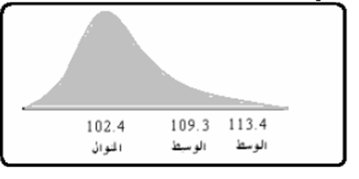 الوسط الحسابي : 113.4 ، الوسيط : 109.3 = Med ، المنوال : 1024= Mod أي أن : الوسط > الوسيط > المنوال ، إذاً توزيع بيانات الأجور موجب الالتواء.