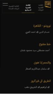 “خط مفتوح” لـ أحمد مصطفى سيد محمود عثمان، “الطريق الي فيراكروز” لـ محمد إبراهيم محمد الشربيني دهب، “بعد زمن” لـ علياء أنور سعيد، “تورونتو – القاھرة” لـ حسام الدين محمد أحمد العربي، “والنجم إذا هوى” لـ محمد سلمان عبدالكريم الصفار.