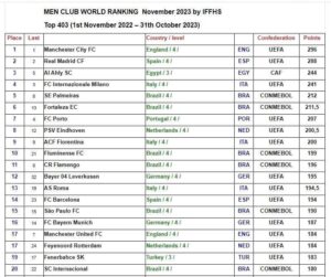 النادي الأهلي يتقدم من المركز الخامس الى المركز الثالث على العالم في تصنيف الأندية الاجمالي عن عام كامل من نوفمبر 2022 الى نوفمبر 2023 ، بعد العملاقين مانشيستر سيتي صاحب المركز الأول وريال مدريد صاحب المركز الثاني ويتفوق الأهلي على باقي أندية العالم